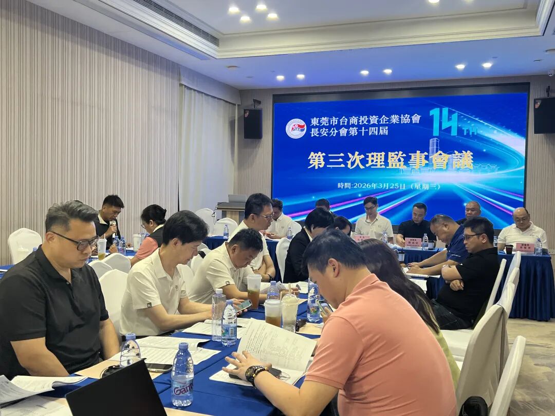 3月25日,召开了长安台商分会第十四届第三次理监事会议,由吴贤达会长主持,张世明秘书长担任司仪。会议首先由张世明秘书长作会务工作报告,并通报第十四届2026年度行事历。随后,邱富美财务长作财务报告,提醒尚未缴纳理监事基金捐款的干部尽快安排,并协助收取2026年度会费;各功能小组组长依次汇报了近期工作情况。