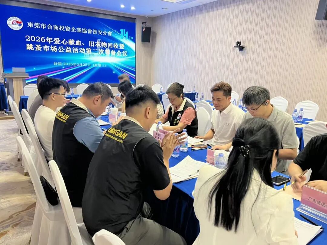 3月25日,召开了2026年爱心献血、旧衣物回收暨跳蚤市场公益活动筹备会议,会议由郑兆凯副会长主持,张世明秘书长担任司仪。本次活动由东莞市中心血站、东莞市台商协会长安分会、东莞市长安慈善会联合主办,长安镇统战办、人才服务中心、公共服务办、卫生健康局等单位代表出席会议。