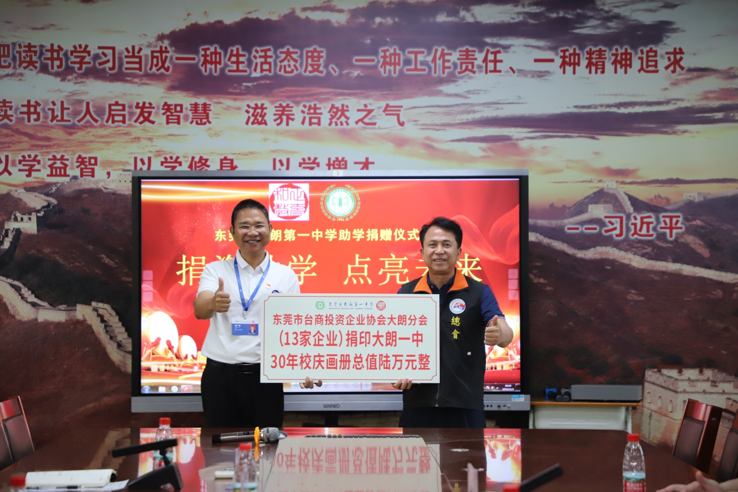 原来,此次前来是事出有因,在不久前的10月15日双方座谈之时,学校透露即将于本月迎来极具纪念意义的30周年校庆。然而,在校庆筹备工作推进过程中,遇到了资金方面的难题,特别是在校庆纪念册刊物及专题片的制作环节,出现了高达22万元的经费缺口。对此,钟广春校长郑重地向大朗台商分会发出诚挚求助,恳请大朗台商分会帮忙能向各爱心企业发出倡议,对于每一家慷慨相助的爱心企业,定会在纪念册上进行宣传鸣谢,并授予荣誉证书,让这份爱心之举永远铭刻在一中的发展历程之中。