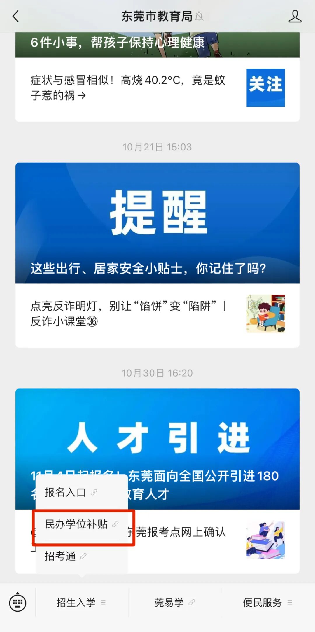 (二)手机微信版:关注“东莞市教育局”微信公众号(微信号dg-jyj),点击“招生入学”—“学位补贴”栏目。