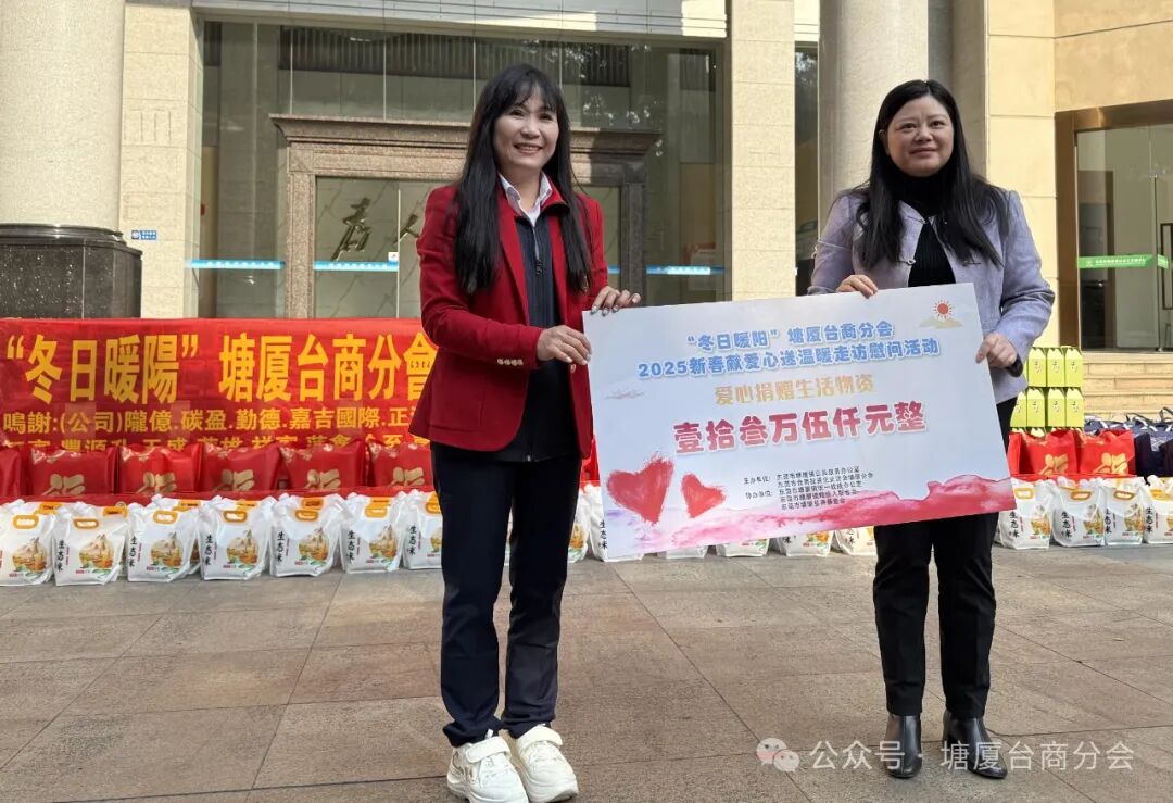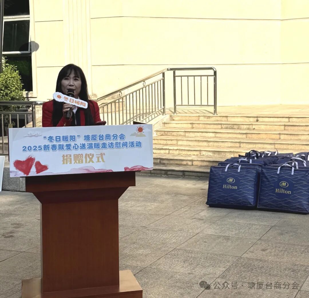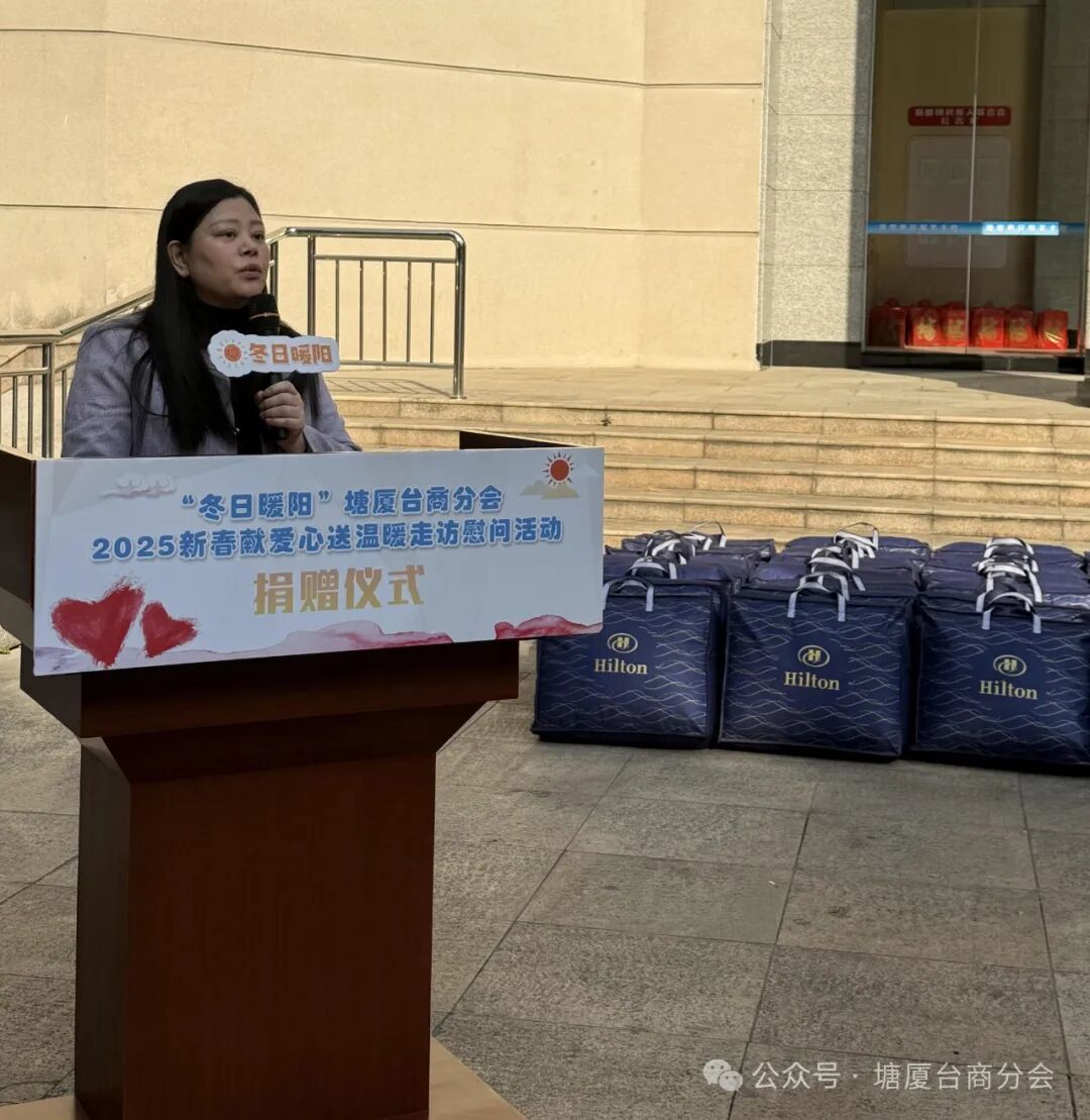 1月8日上午,暖阳倾洒,爱满人间。在塘厦镇爱民街11号惠民服务大楼一楼,塘厦台商分会2025新春献爱心送温暖捐赠仪式盛大启幕。温莉翎执行副会长代表分会作了精彩发言。