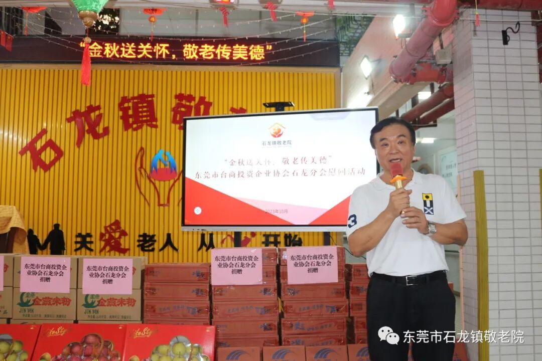 东莞市台商投资企业协会石龙分会王会长致辞,尊老敬老是中华民族的传统美德,爱老助老是全社会的共同责任,切实为老人办好事办实事,同时祝愿各位公公婆婆身体健康,心想事成。