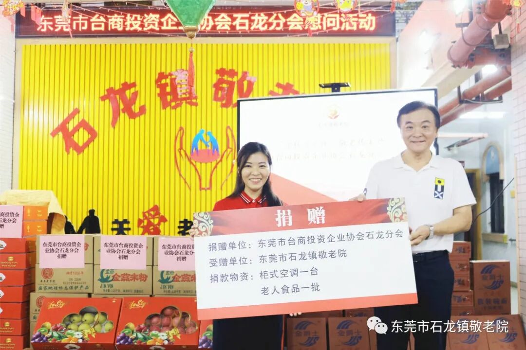 石龙镇敬老院院长邓汝婷致辞代表全体老人及员工对出席今天活动的来宾表示热烈地欢迎,并感谢东莞市台商投资企业协会石龙分会对老人家的关心,为我院老人捐赠了食品一批和柜式空调一台等物资。