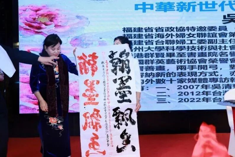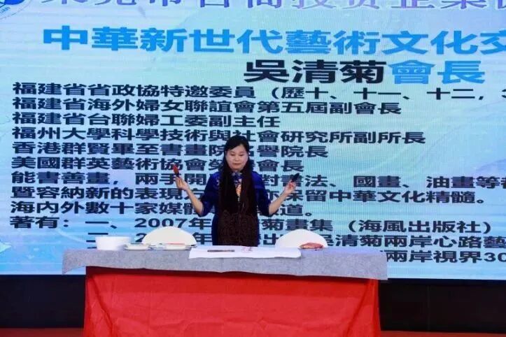中华新世代艺术文化交流协会会长吴清菊会长,并为活动大展左右双手同时书写才艺;