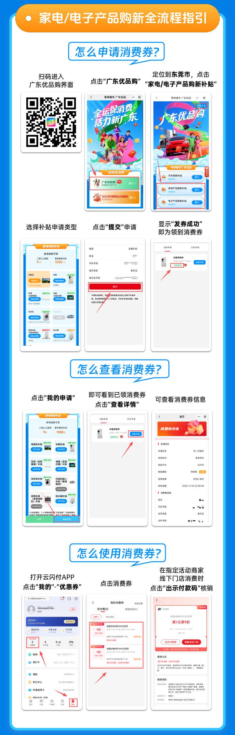 一、个人消费者通过“云闪付APP”或银联商务广东分公司公众号进入“广东优品购”运营平台,填写个人信息(身份证号、姓名、手机号)完成实名认证注册。注册成功后,进入指定活动申领页面,按要求申领相应品类的消费券,消费券有效期为3天。