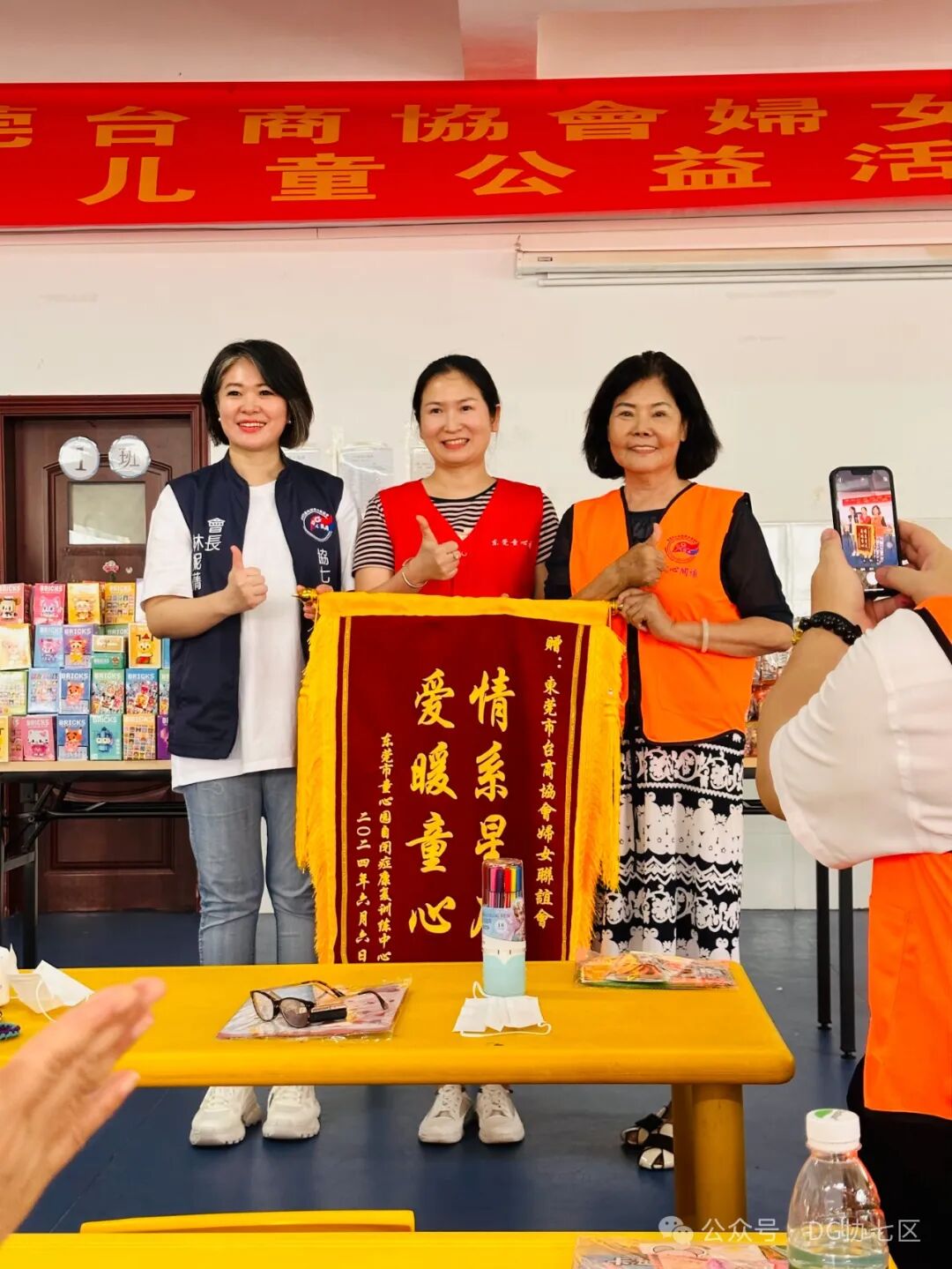 东莞市台协妇联总会戴秀霞会长以及林妮蒨副会长一同上台颁赠捐赠物资并接受东莞市童心园自闭症儿童康复中心陈园长颁赠感恩锦旗。