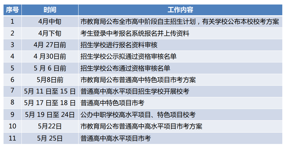 答:4月中下旬,市教育局将公布今年全市高中阶段学校自主招生计划,具体请留意“东莞慧教育”公众号;公布自主招生计划后,各招生学校也将在本校微信公众号或官方网站公布本校自主招生方案,明确考试内容及时间,具体请留意各普通高中学校发布信息。5月中旬,市教育局将公布普通高中高水平项目市考和特色项目市考工作方案,明确考试内容及考点地址。