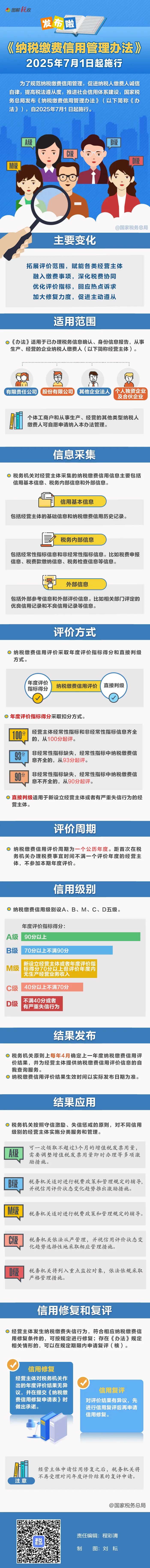 为了规范纳税缴费信用管理,促进纳税人缴费人诚信自律,提高税法遵从度,推进社会信用体系建设,国家税务总局发布《纳税缴费信用管理办法》,自2025年7月1日起施行。政策要点有哪些,一图了解