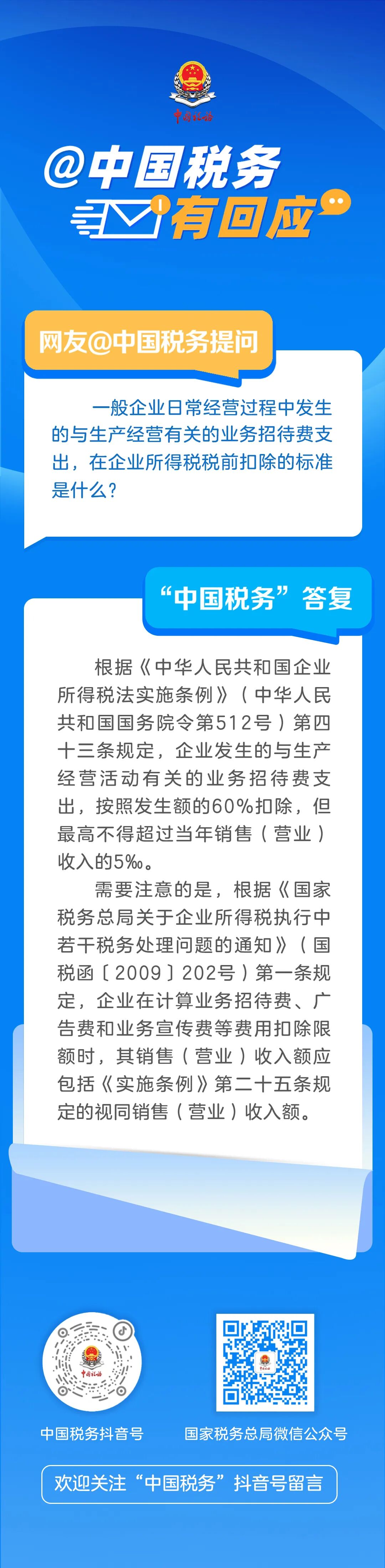 有网友问:“一般企业日常经营过程中发生的与生产经营有关的业务招待费支出,在企业所得税税前扣除的标准是什么?一起来看看回复吧↓