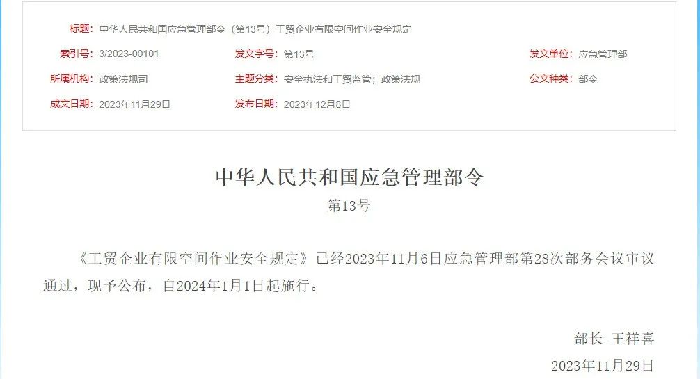 《工贸企业有限空间作业安全规定》已经2023年11月6日应急管理部第28次部务会议审议通过,现予公布,自2024年1月1日起施行。