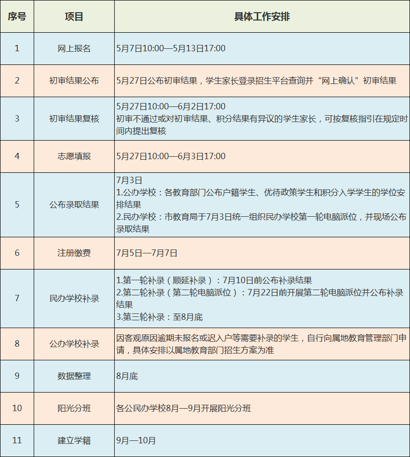 符合我市招生入学条件、计划在我市入读小学一年级或初中一年级的学生,均须在5月7日10:00至5月13日17:00期间登录招生平台进行网上报名。凡未经招生平台招录的学生,不能入学、不能建立学籍。