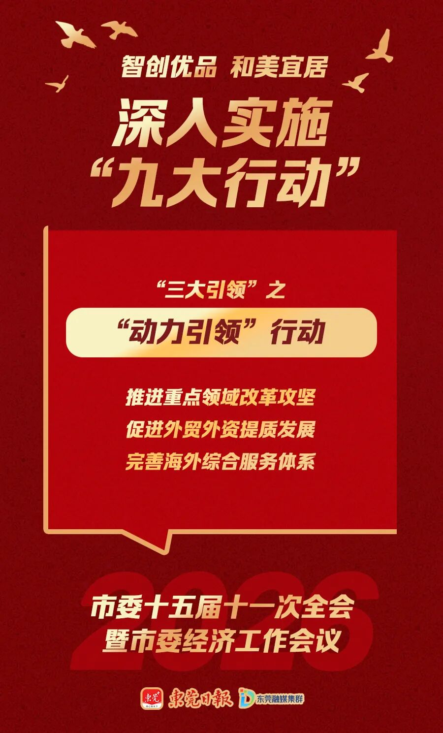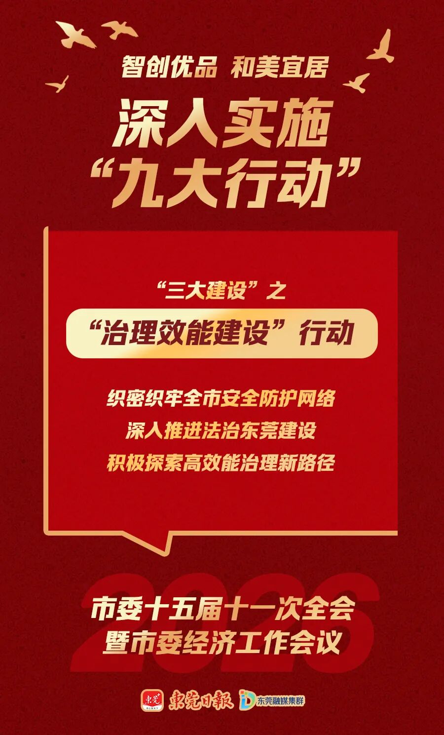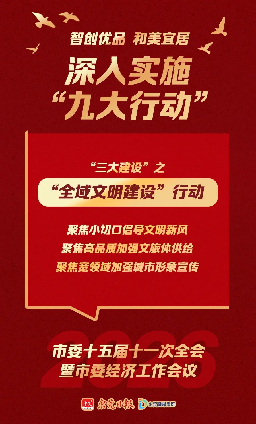 “九大行动”包括湾区引领、动力引领、科创引领等“三大引领”行动,产业提升、消费投资提振、环境提升等“三大提升”行动,品质民生建设、全域文明建设、治理效能建设等“三大建设”行动,它们共同构成建设“智创优品、和美宜居”现代化新东莞的施工图和任务书。