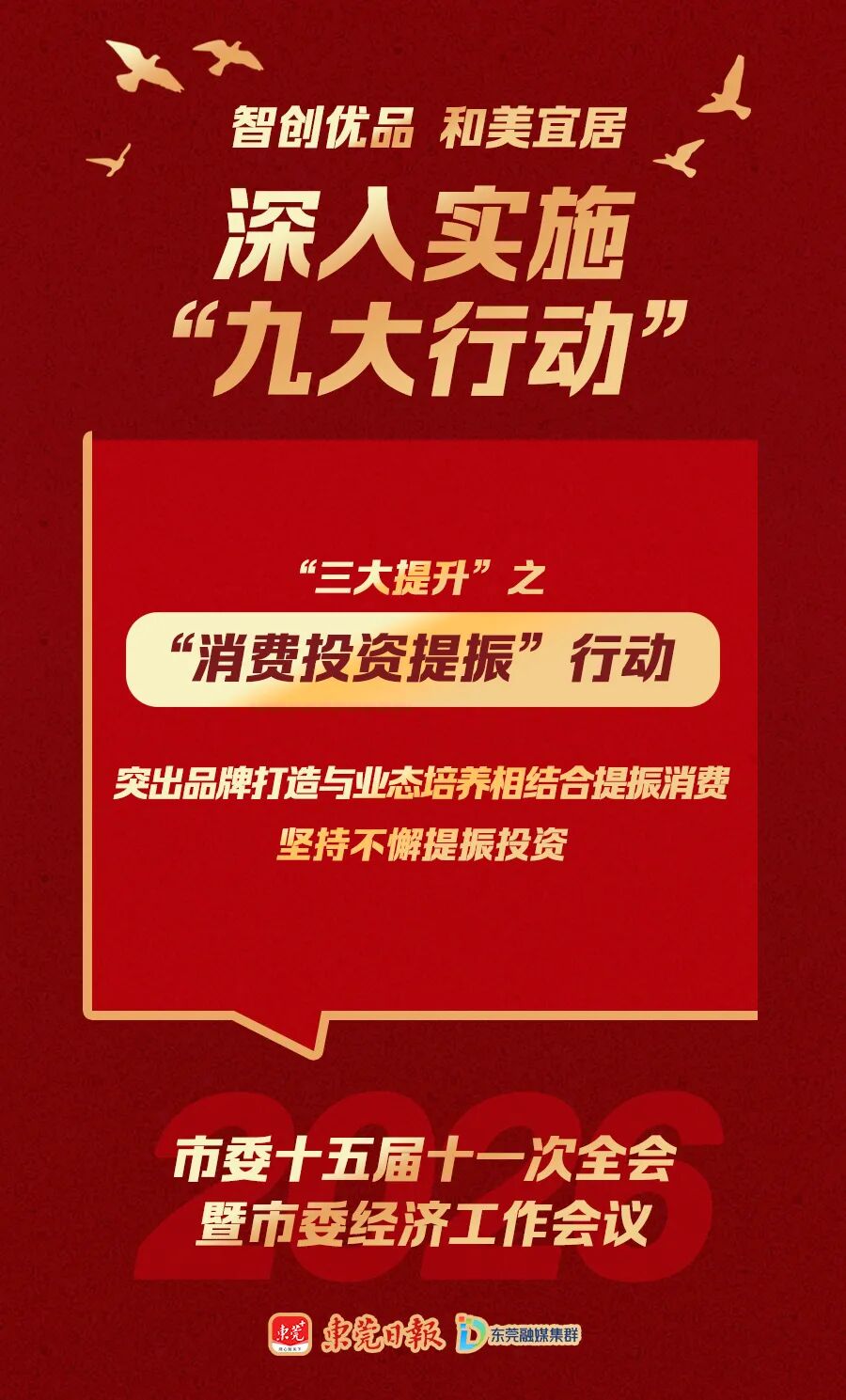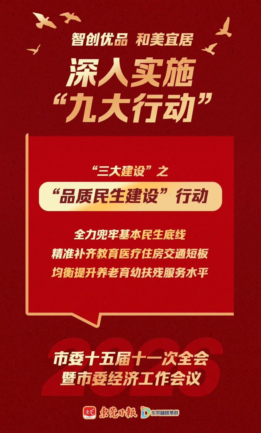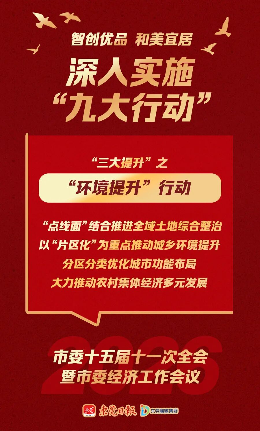 “九大行动”包括湾区引领、动力引领、科创引领等“三大引领”行动,产业提升、消费投资提振、环境提升等“三大提升”行动,品质民生建设、全域文明建设、治理效能建设等“三大建设”行动,它们共同构成建设“智创优品、和美宜居”现代化新东莞的施工图和任务书。