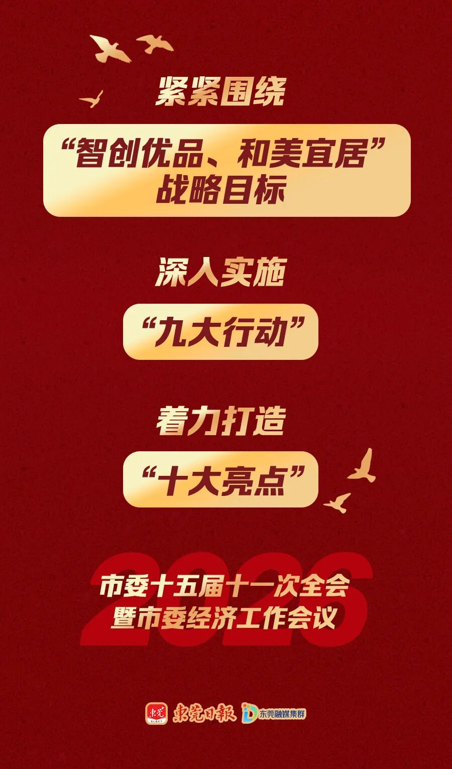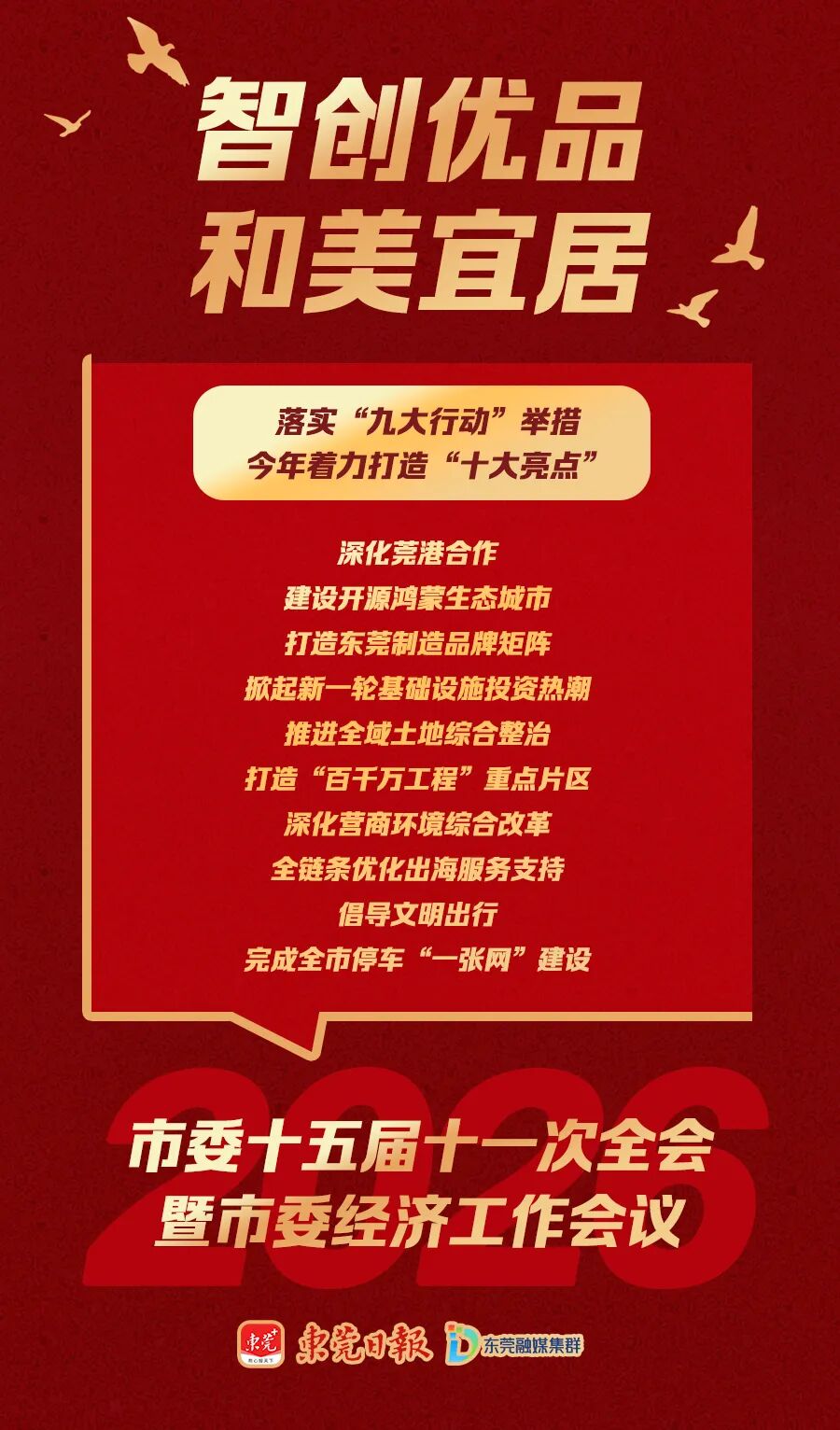 1月5日,市委十五届十一次全会暨市委经济工作会议召开,全面部署2026年工作。记者从会上获悉,全会报告提出,深入实施“九大行动”,着力打造“十大亮点”,全力推动“十五五”开好局、起好步,加快建设“智创优品、和美宜居”的现代化新东莞。