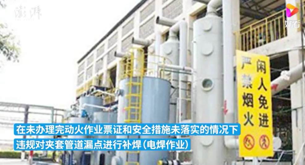 山西临汾一公司发生爆炸事故,造成4人死亡。经初步调查分析,事故的直接原因是:二硝车间硝化分离器至水洗锅间的放料蒸汽夹套管道有漏点,在未办理完动火作业票证和安全措施未落实的情况下,违规对夹套管道漏点进行补焊(电焊作业),导致放料管道内的2,4-二硝基氯苯受热分解爆炸。